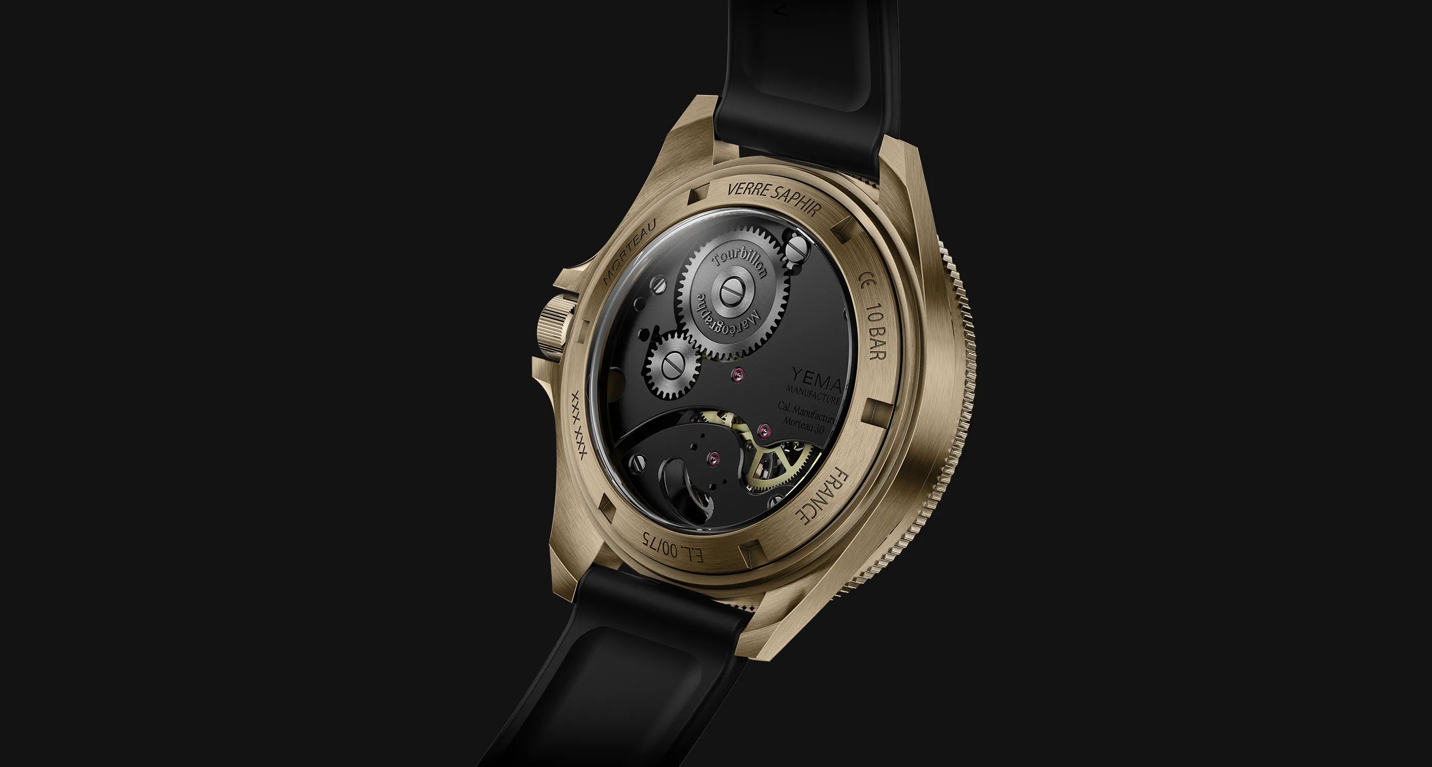 CMM.30(Calibre Manufacture Morteau 30) 뚜르비옹의 유니크한 디자인은 스마트한 아키텍처와 고품질 프랑스-스위스 구성요소 덕분에 압도적인 성능을 제공합니다. La Chaux-de-Fonds의 워치 메이커인 올리비에 모리(Olivier Mory)가 전적으로 설계하고 개발한 레귤레이터는 스위스에서 제조되며 브릿지와 메인 플레이트는 YEMA의 모흐또 작업장에서 제조됩니다.