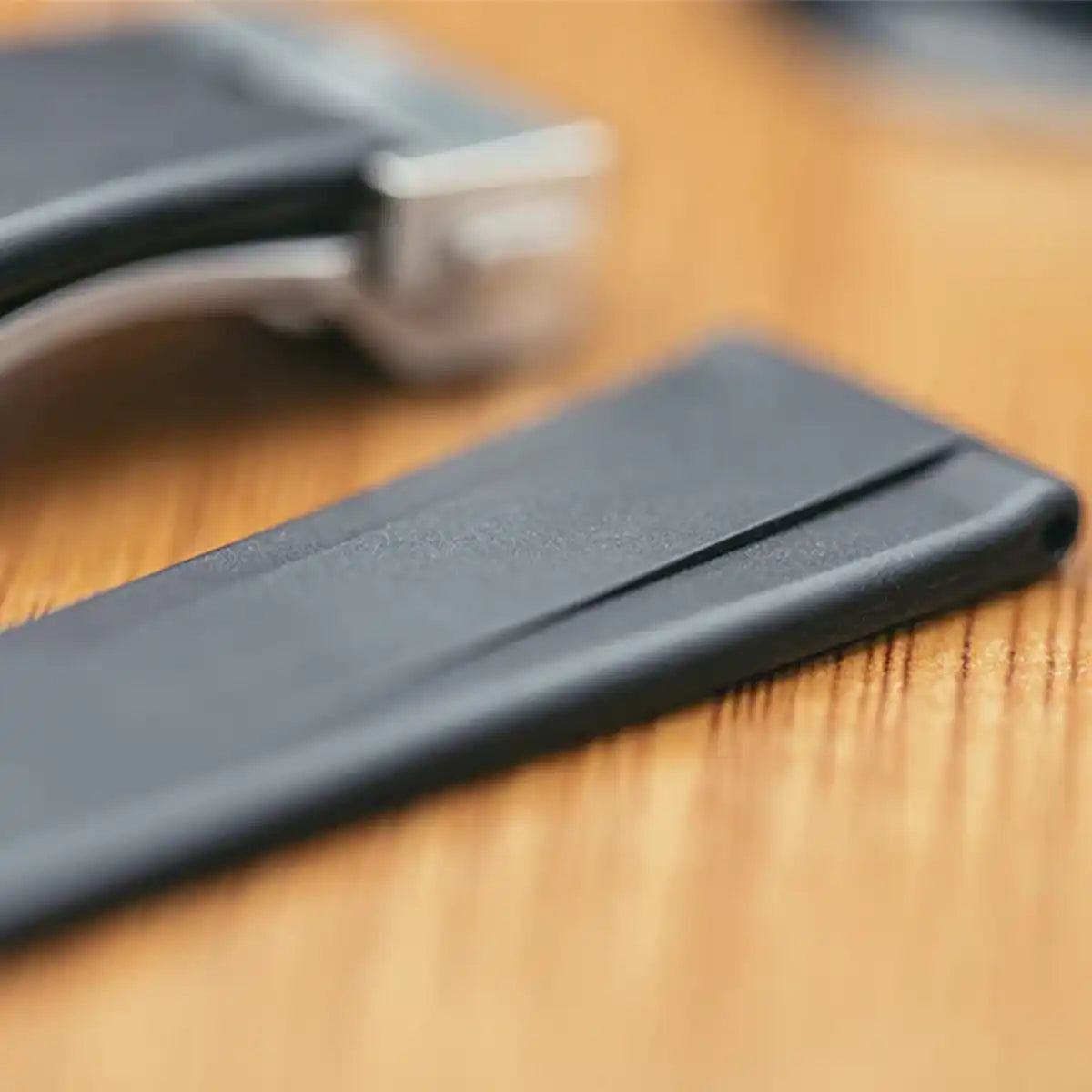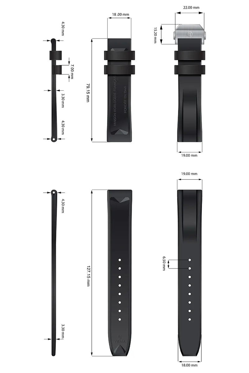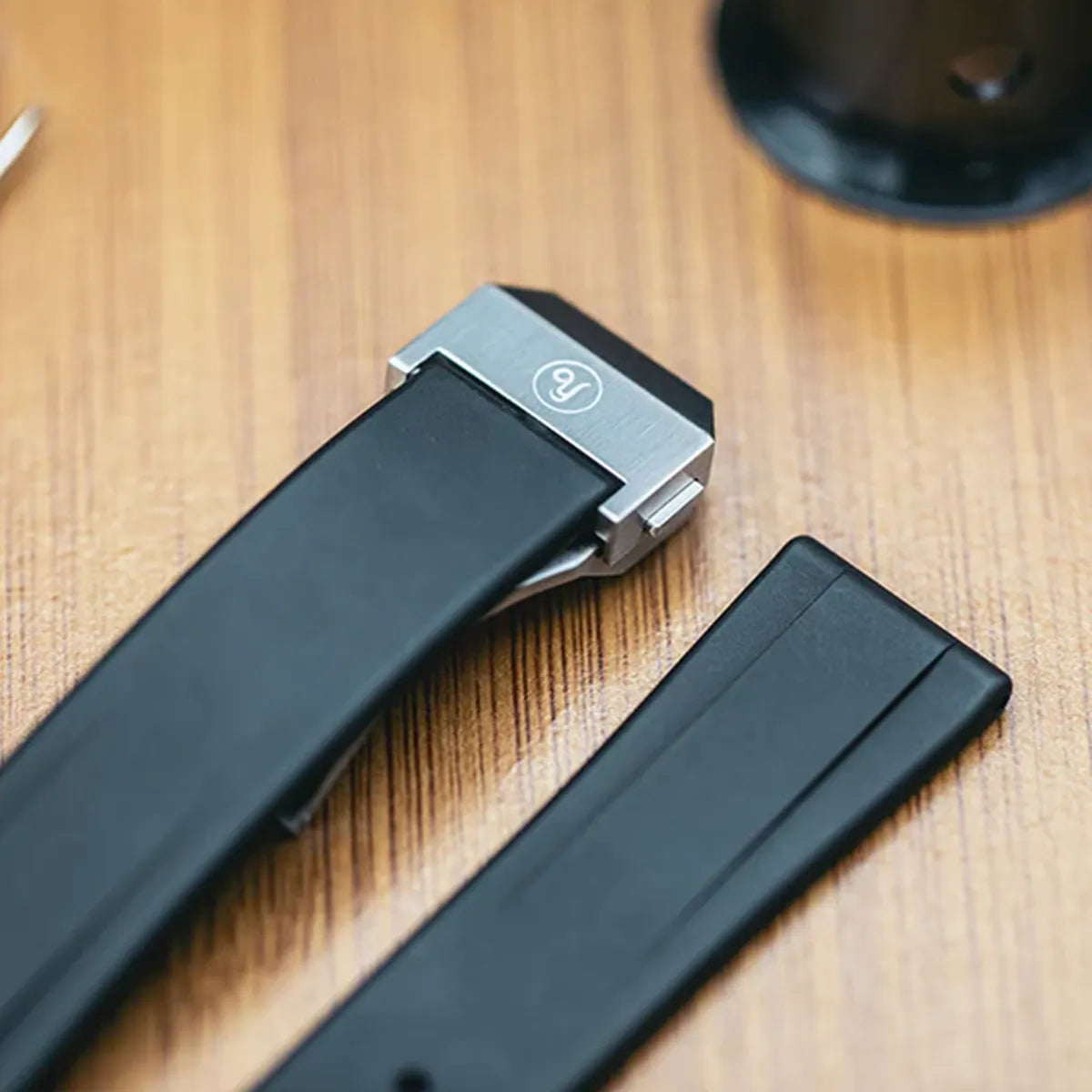 디플로이먼트 클래스프가 장착된 YEMA의 FKM Viton© 러버 스트랩은 프리미엄 품질의 고무로 제작된 고급 스트랩으로 최고의 내구성을 제공하는 동시에 먼지 방지 기능이 뛰어납니다. 스트랩은 자유롭게 조절 가능하여 모든 착용자의 손목에 맞게 조절됩니다.