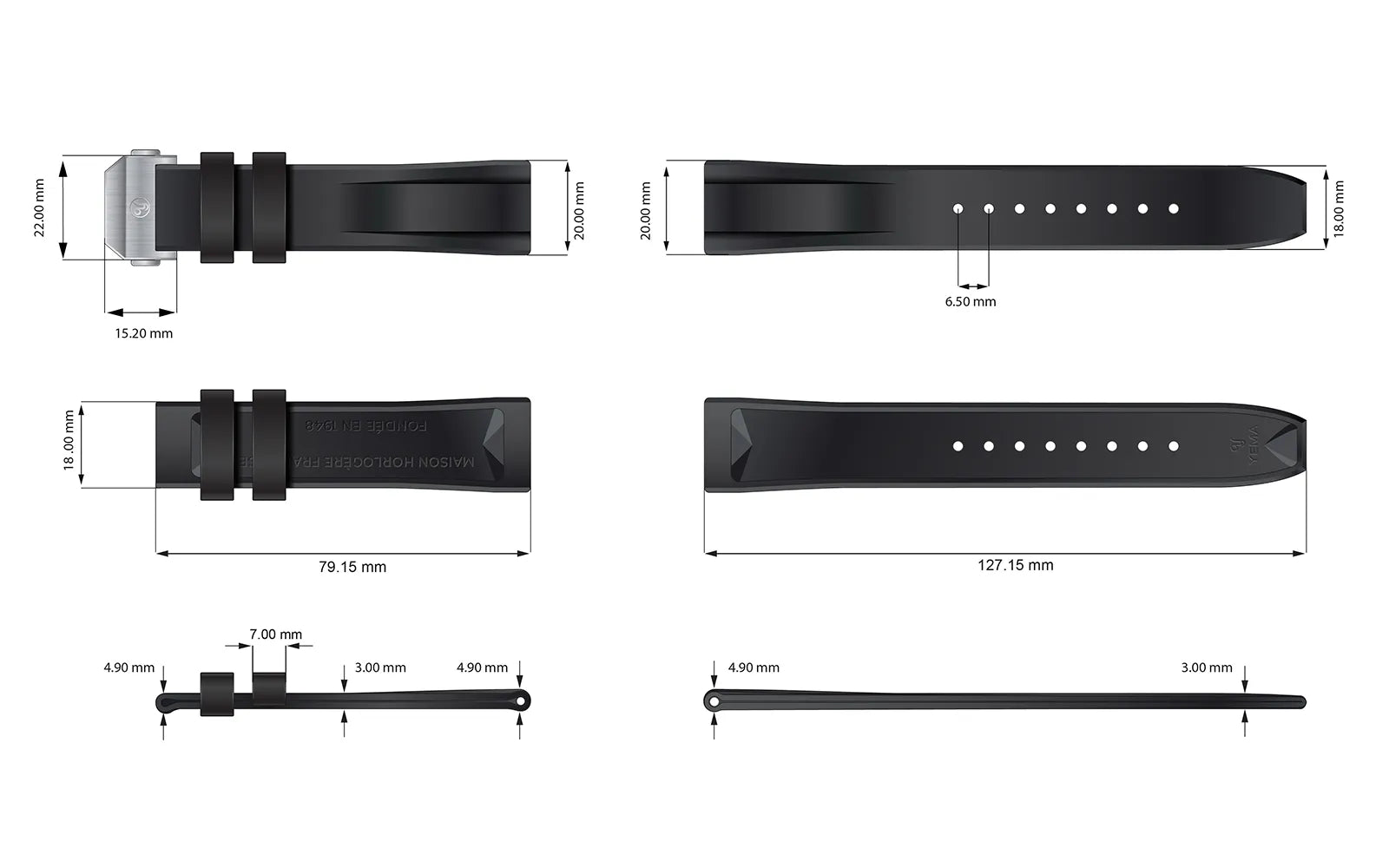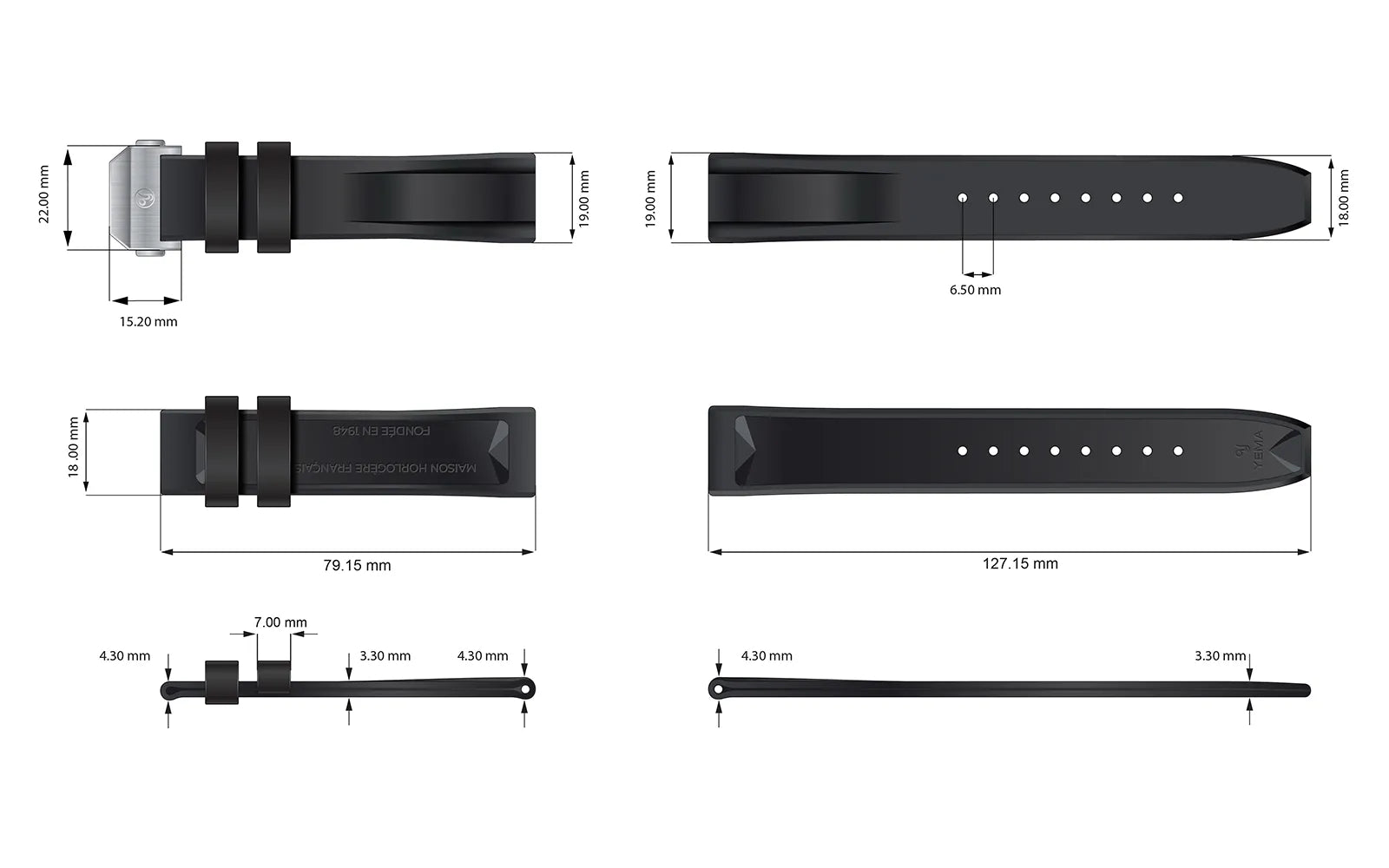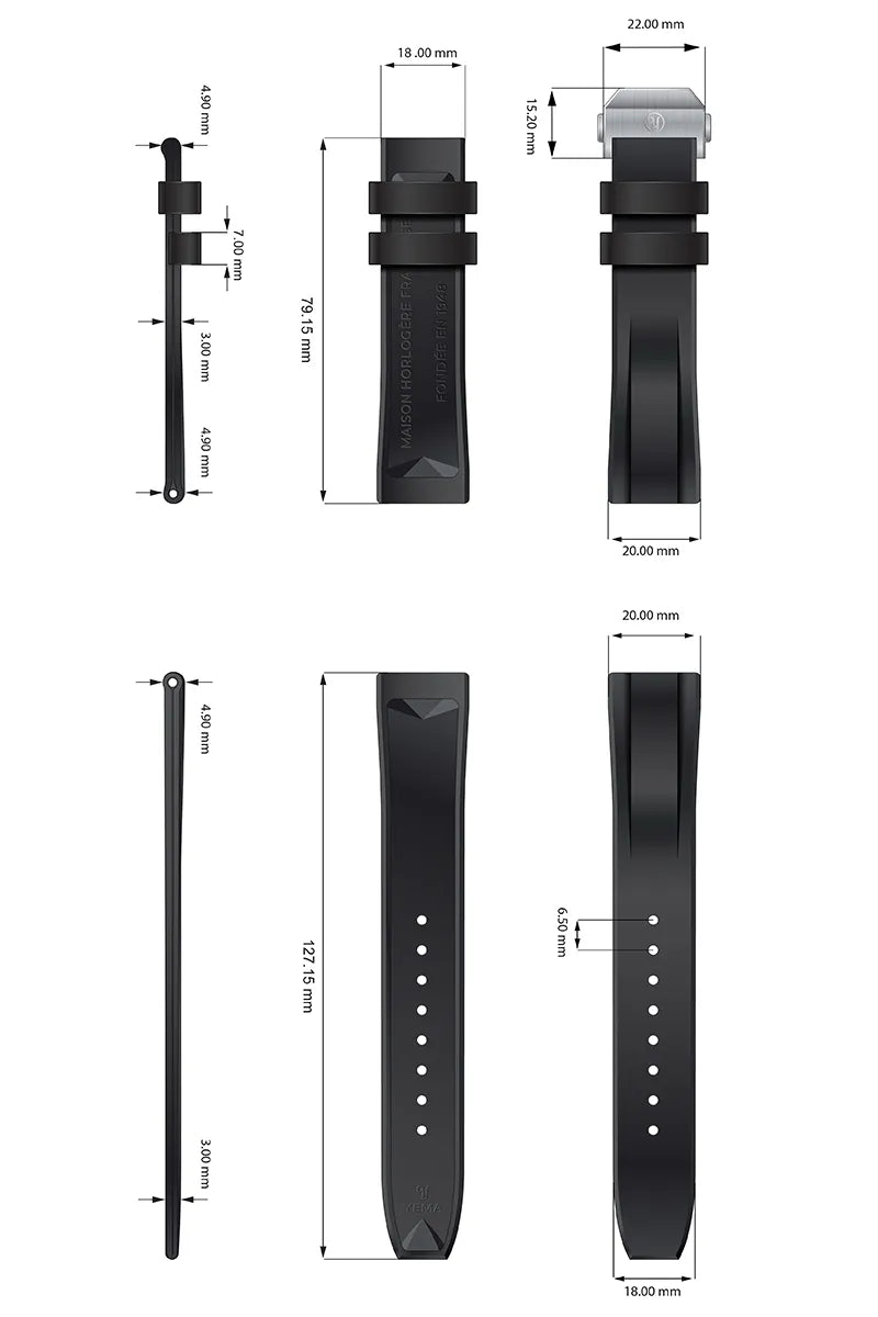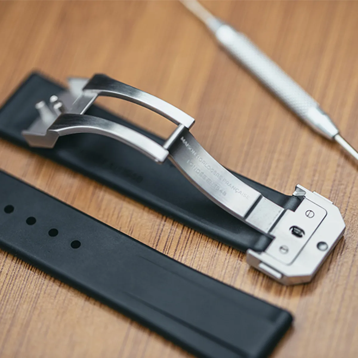 디플로이먼트 클래스프가 장착된 YEMA의 FKM Viton© 러버 스트랩은 프리미엄 품질의 고무로 제작된 고급 스트랩으로 최고의 내구성을 제공하는 동시에 먼지 방지 기능이 뛰어납니다. 스트랩은 자유롭게 조절 가능하여 모든 착용자의 손목에 맞게 조절됩니다.