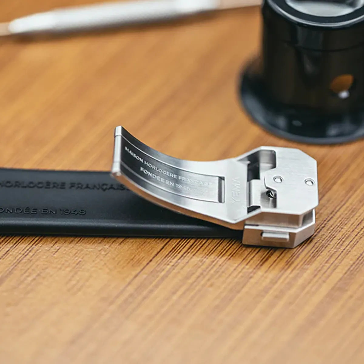 세련된 316L 스테인리스 스틸 디플로이먼트 버클은 스타일과 편안함을 더해줍니다. YEMA의 로고와 MAISON HORLOGÈRE 1948이라는 문구가 브러시 처리된 스틸 표면에 우아하게 새겨져 있습니다.