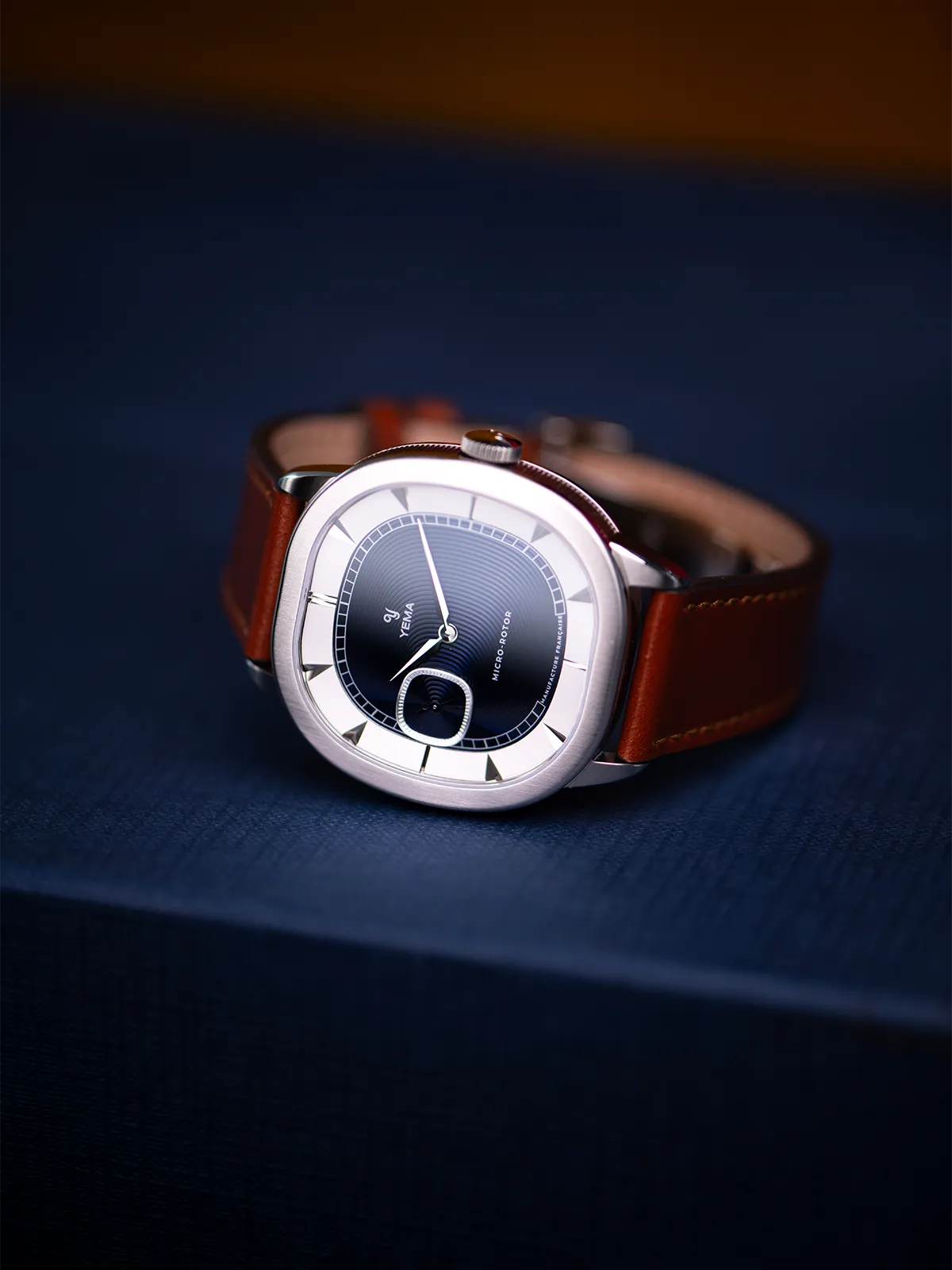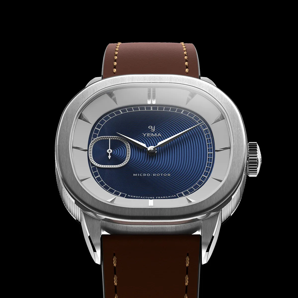 사파이어 글래스 케이스백을 통해 YEMA의 인하우스 마이크로 로터 칼리버 CMM.20의 아름다움을 감상할 수 있습니다. 로듐 도금된 브릿지는 갈바닉 처리 후 코트 드 제네브 선레이 패턴으로 장식되어, 역동적이면서도 정제된 인상을 줍니다. 무브먼트가 회전할 때마다 빛과의 상호작용으로 우아한 반짝임이 연출되어, 마치 표면이 끊임없이 움직이는 듯한 시각적 깊이를 선사합니다.