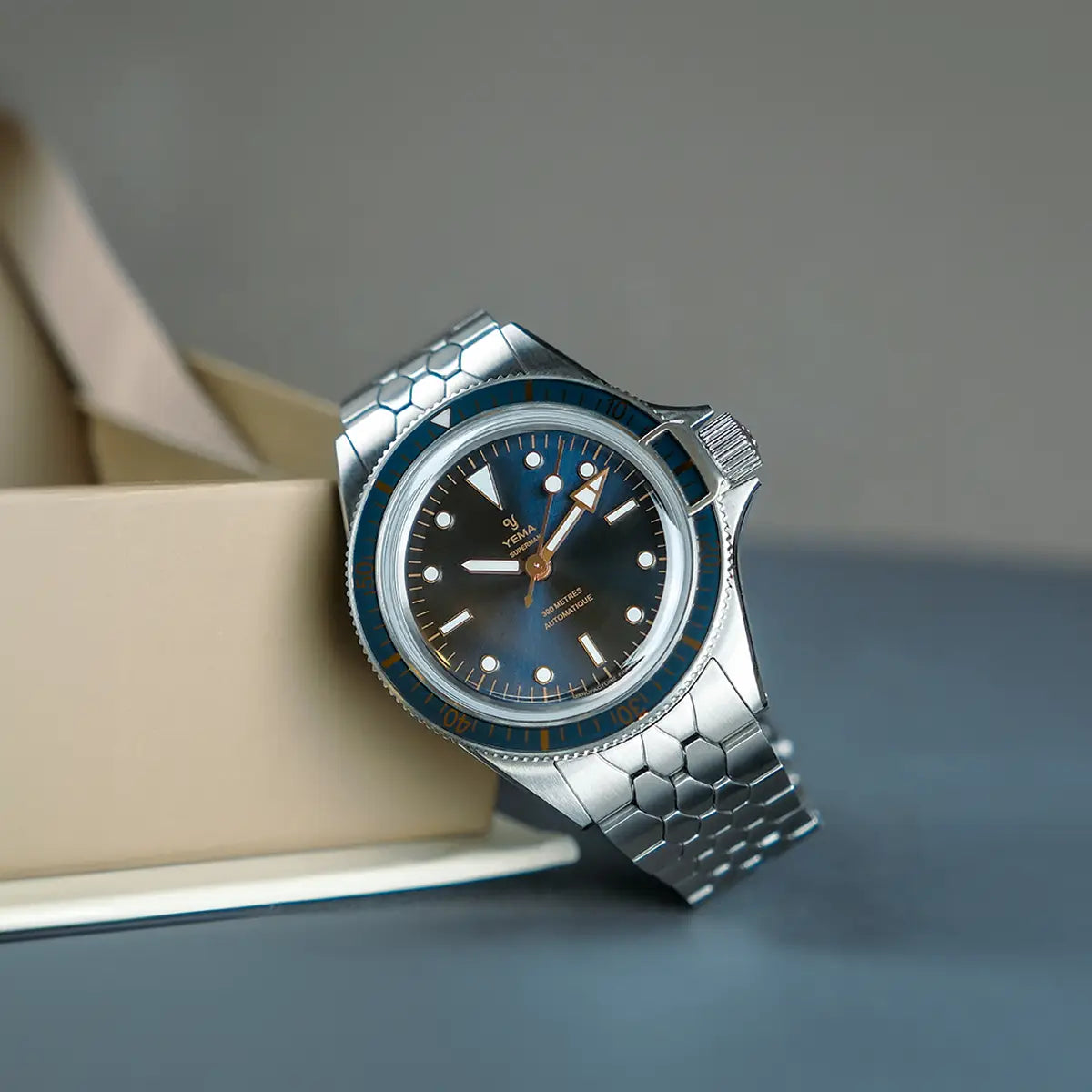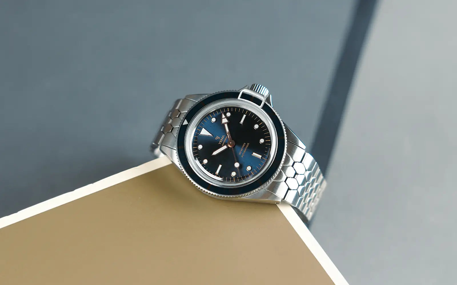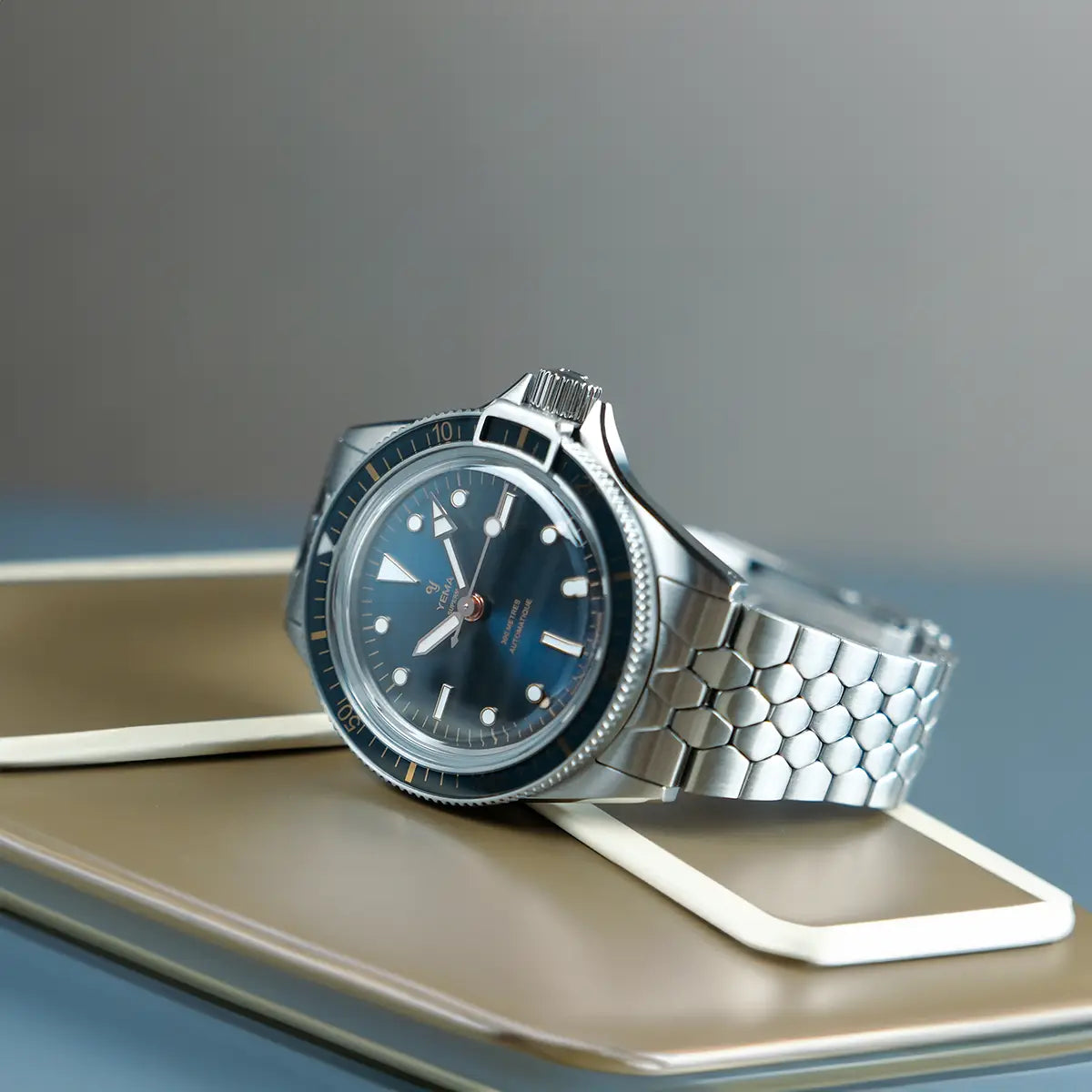 또한 이 새로운 케이스에는 우아한 브러쉬 마감이 적용되었으며, 베벨 엣지에는 폴리싱 마감이 적용되어 아름다운 대비효과를 만듭니다. 이 모델은 현대 기계식 다이빙 시계의 모든 장점과 기능을 갖추며 아름다운 빈티지 외관을 보여줍니다.