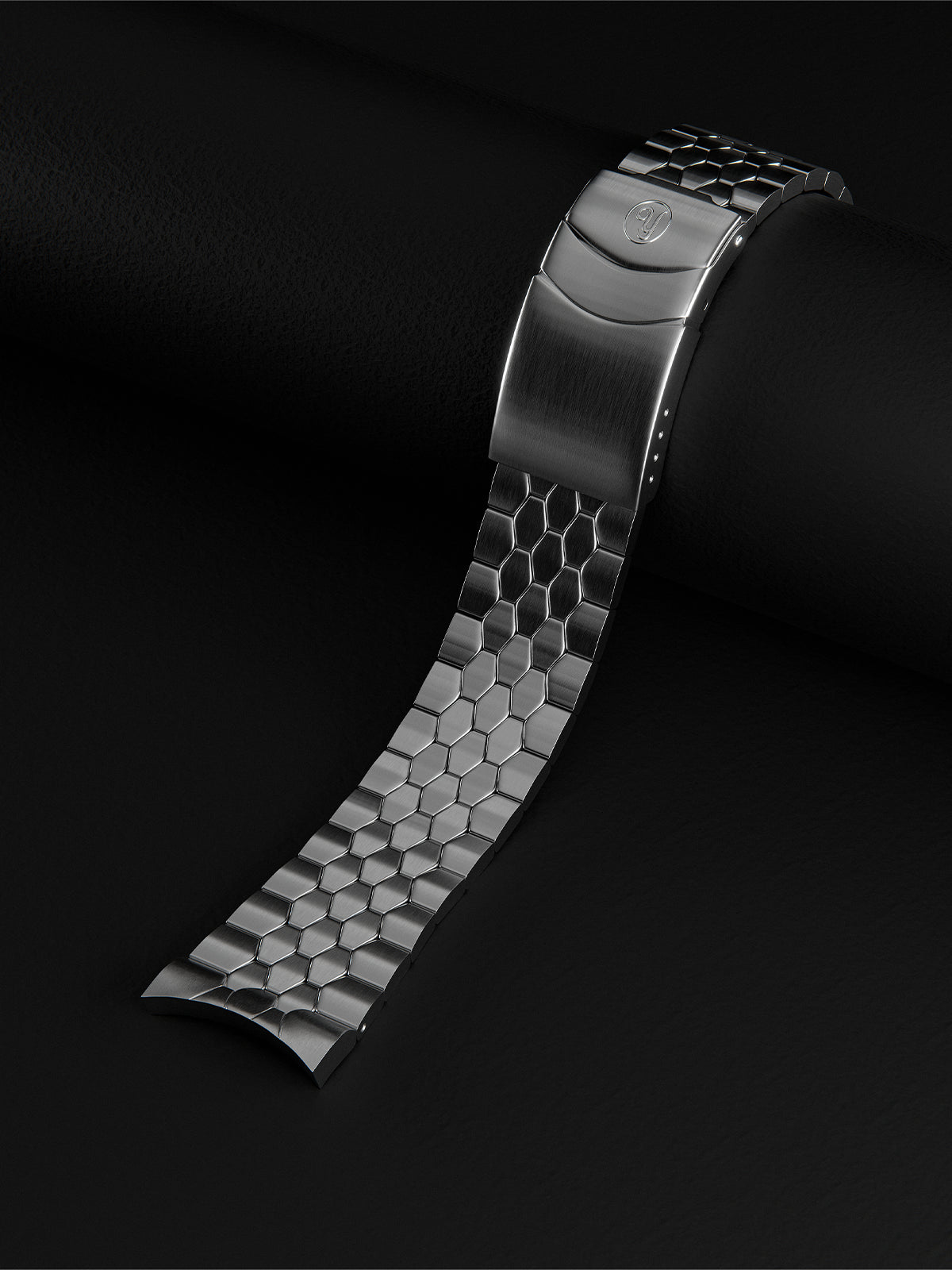 이 새로운 39mm 316L 스테인리스 스틸 케이스는 20mm 곡선형 러그와 폴리싱 처리된 베벨과 뚜렷한 대조를 이루는 브러시 마감을 특징으로 합니다.