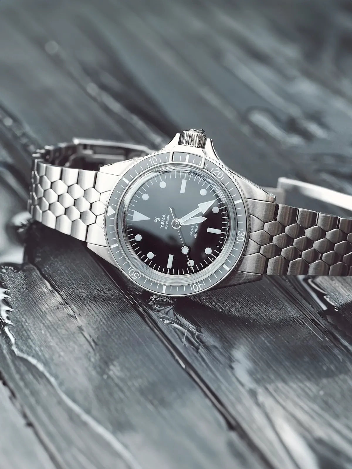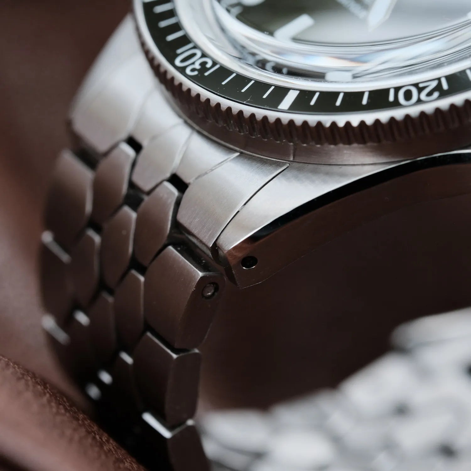 이 새로운 케이스는 우아한 수직 방향의 브러싱과 베벨의 폴리싱 처리가 우아한 모습을 보여줍니다. 현대식 오토매틱 다이버 시계의 모든 장점과 기능을 갖춘 독특한 네오 빈티지 외관은 다른 시계들과 차별성을 보여줍니다.