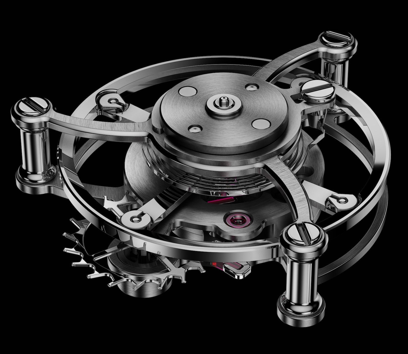 투르비용은 밸런스 휠과 헤어스프링, 이스케이프 휠, 레버, 그리고 이를 구동하는 세컨드 휠을 포함한 회전 케이지로 구성되어 있습니다. 이 케이지는 60초마다 360도 회전하며, 중력의 영향을 상쇄하고 자세 변화에 따른 오차를 줄여줍니다.