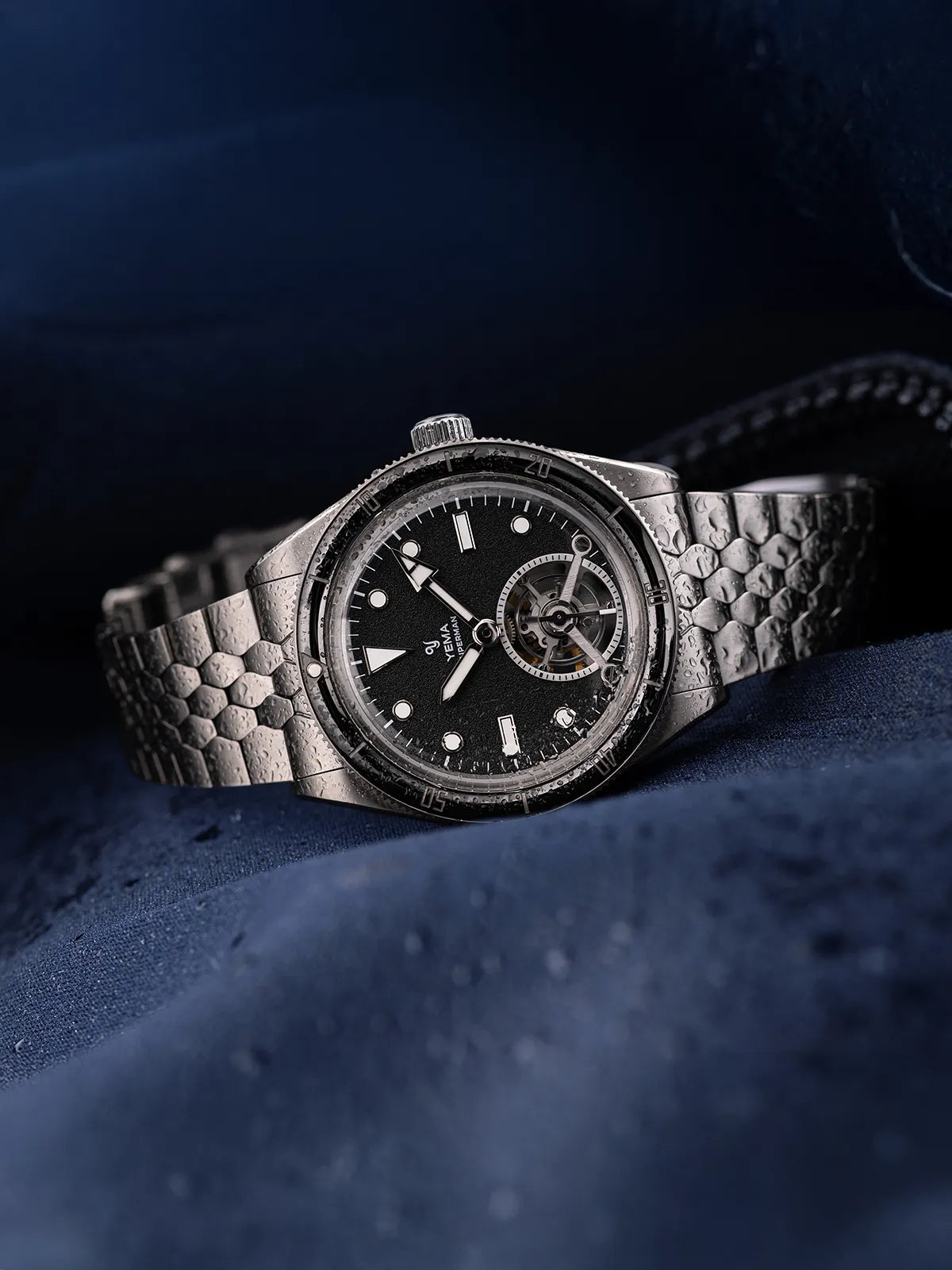 2025년 에디션을 위해, 우리는 1963년 처음 선보인 YEMA의 가장 아이코닉한 모델, 슈퍼맨 프로페셔널 다이버 워치를 선택했습니다. 이번에는 인하우스 매뉴팩처 투르비용 무브먼트를 탑재하여, 기술적 혁신, 오뜨 오롤로지 수준의 마감, 그리고 견고한 툴 워치 사양을 결합했습니다.