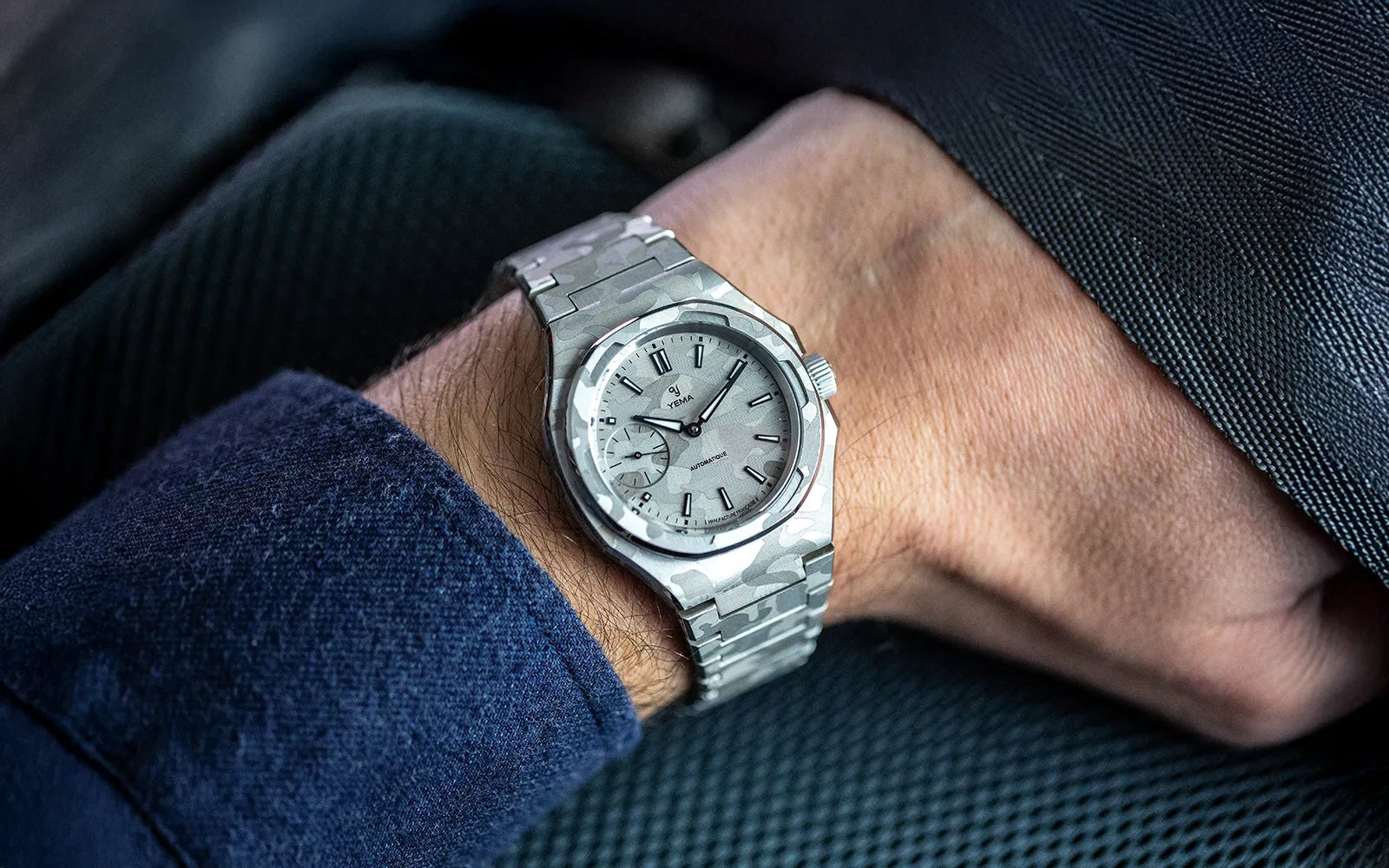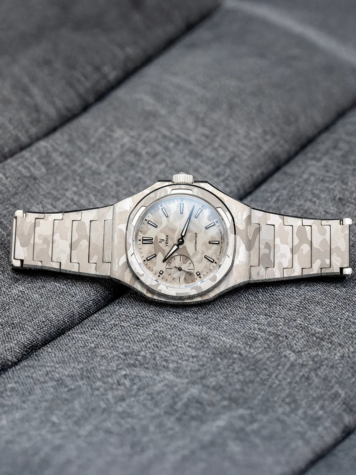 다이얼, 케이스, 브레이슬릿에는 레이저 피니시로 “스노우” 카모 패턴이 적용되어 현대적이면서 세련된 비주얼 시그니처를 만들어냅니다. 은은한 모노크롬 처리로, 빛의 각도에 따라 서로 다른 표정을 보여주며, 수집가를 염두에 둔 절제되고 모던한 인상을 선사합니다.