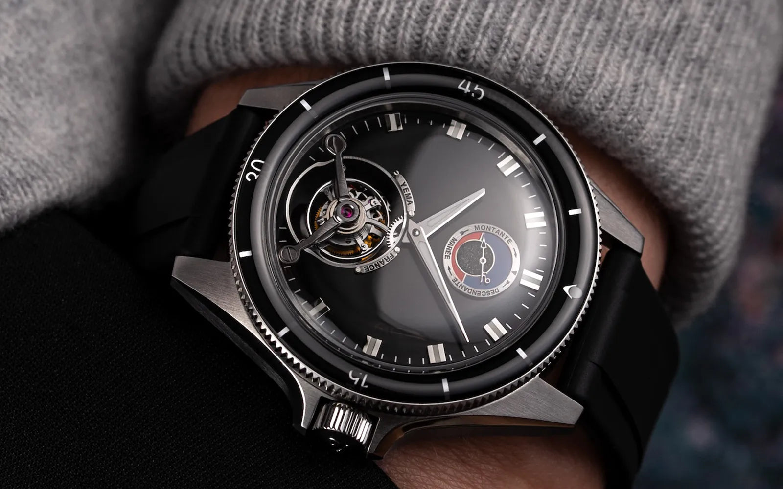 "요팅그래프 뚜르비옹 마레오그래프(Yachtingraf Tourbillon Maréographe)는 혹독한 환경을 견딜 수 있는 진정한 툴 워치라는 목적을 위해 설계되었습니다. 이중 돔 사파이어 크리스탈, 단방향 카운트업 사파이어 베젤, 10 기압 방수, 높은 항자성(2,000가우스) 및 충격 방지(5,000G) 기능을 제공합니다. 뿐만 아니라 4일 이상의 파워 리저브를 제공하는 탁월하고 정밀한 뚜르비옹 무브먼트는 조수의 변화를 표시하는 컴플리케이션을 갖추고 있습니다.