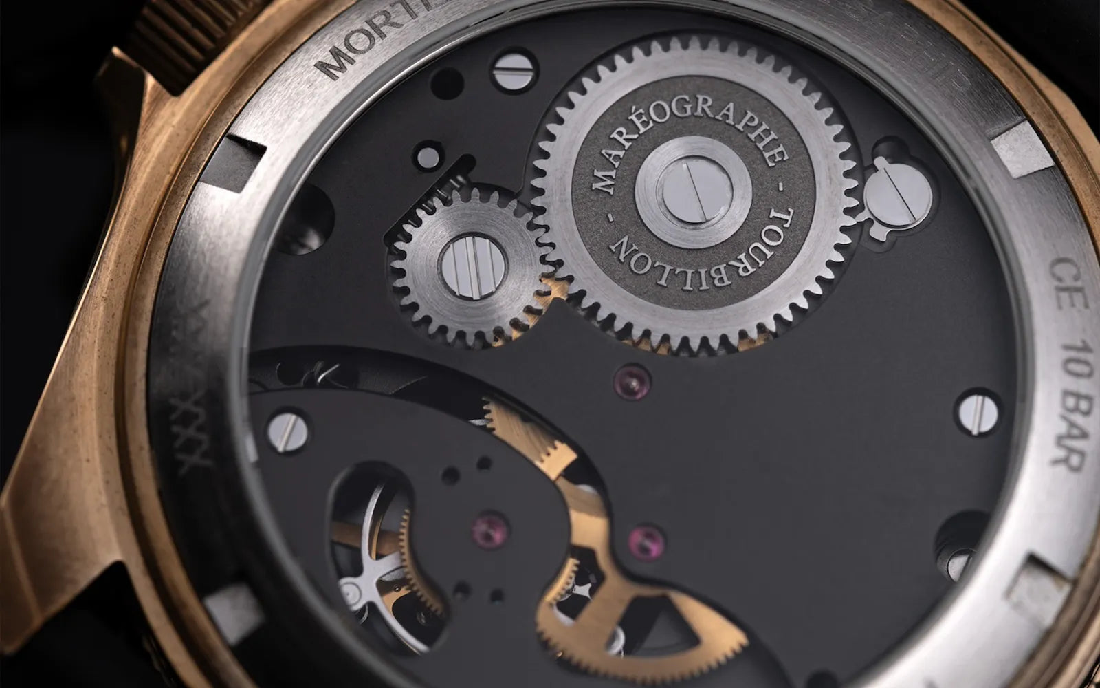 마레오그래프는 다이얼 상단에 위치한 레지스터에 위치한 조수 컴플리케이션으로 구성됩니다. 웅장한 자연 현상을 가시화하기 위해 핸즈는 6시간 12분 7.89초마다 점진적인 반회전(만조에서 간조로 또는 그 반대로 변경)을 하고 12시 25분 15.79초마다 완전히 회전하여 밀물과 썰물을 나타냅니다.